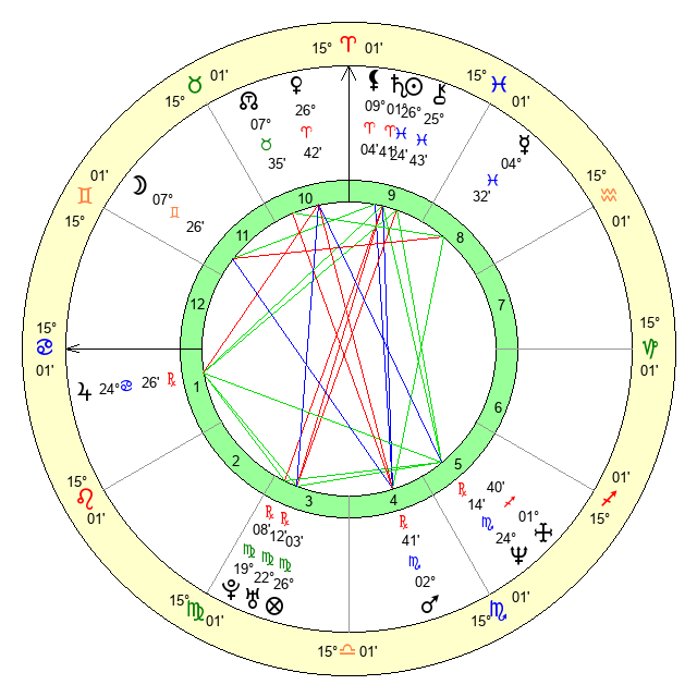 | Moon | 7 Gemini 21 | 4 Scorpio 33 | 21 Cancer 54 |