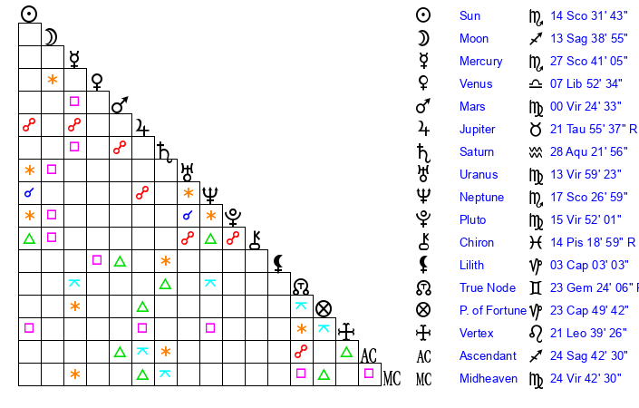 | Neptune | 17 Scorpio 27 | 27 Pisces 23 | 19 Scorpio 26 |