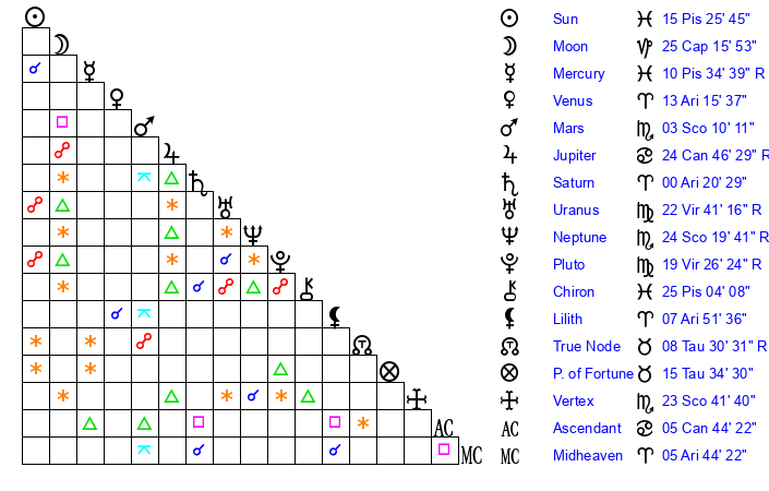 | Sun | 15 Pisces 26 | 16 Pisces 22 | 12 Taurus 34 |