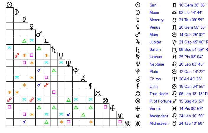 Venus | 20 Gemini 56 | 25 Aries 36 | 22 Libra 24 |