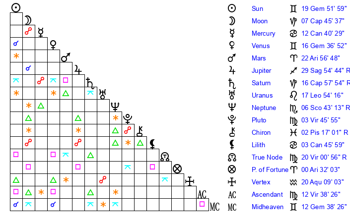 Moon | 7 Capricorn 42 | 14 Sagittarius 12 | 28 Taurus 20 |