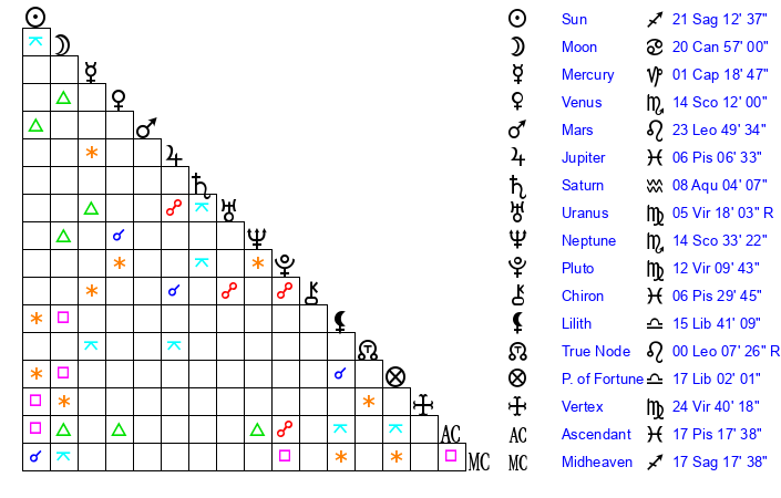 | Pluto | 12 Virgo 10 | 0 Aquarius 32 | 11 Virgo 17 |
