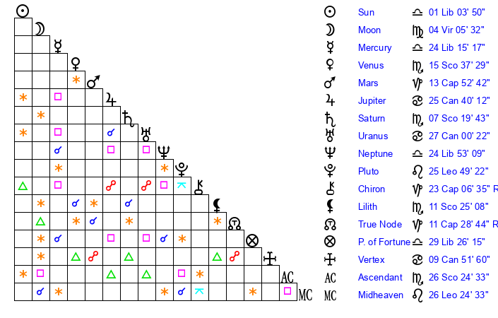| Neptune | 24 Libra 53 | 0 Aries 42 | 27 Libra 23 |