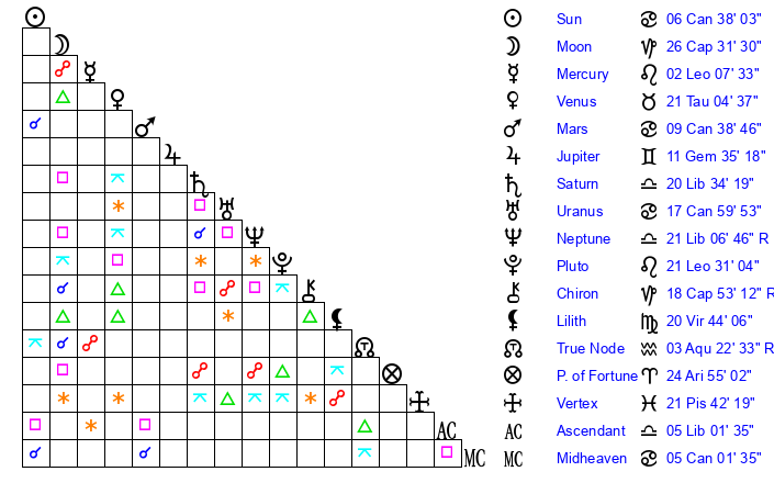 | Moon | 26 Capricorn 32 | 19 Leo 15 | 19 Virgo 24 |