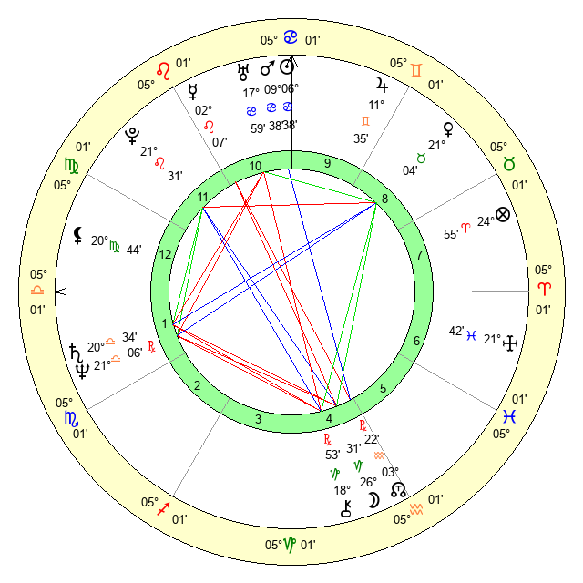 | Sun | 6 Cancer 38 | 7 Cancer 12 | 15 Virgo 41 |