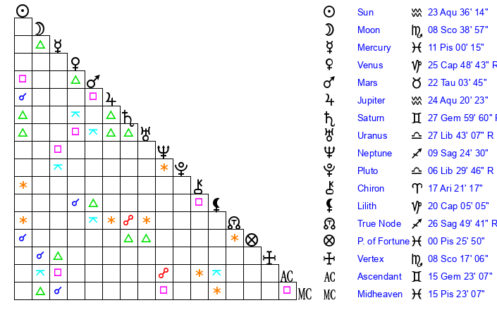 | Jupiter | 24 Aquarius 12 | 11 Gemini 23 | 6 Pisces 0 |