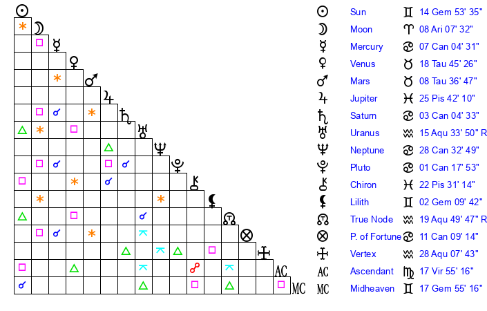 | Sun | 14 Gemini 53 | 16 Gemini 14 | 0 Libra 33 |