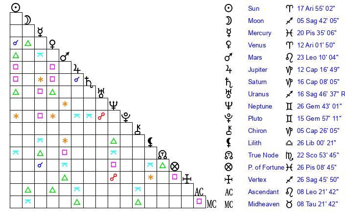 | Sun | 17 Aries 55 | 18 Aries 52 | 17 Leo 5 |