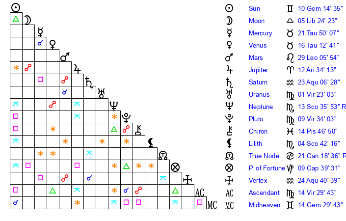 Pluto | 9 Virgo 34 | 3 Aquarius 38 | 10 Virgo 47 |