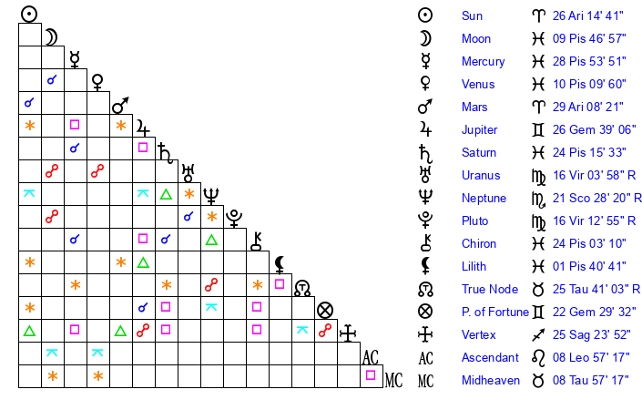 | Venus | 10 Pisces 10 | 24 Pisces 54 | 16 Taurus 11 |