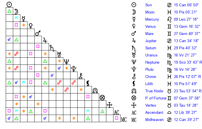 | Moon | 10 Pisces 4 | 9 Sagittarius 30 | 3 Taurus 0 |