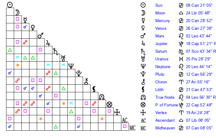 | Sun | 8 Cancer 21 | 9 Cancer 9 | 14 Libra 54 |