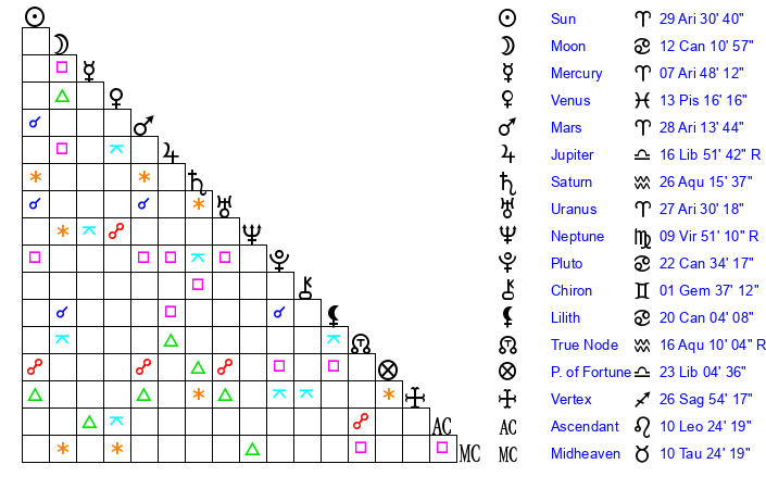 | Uranus | 27 Aries 30 | 25 Taurus 44 | 1 Taurus 19 |