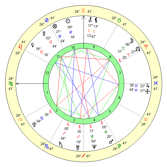 | Moon | 6 Taurus 32 | 24 Virgo 53 | 0 Libra 34 |