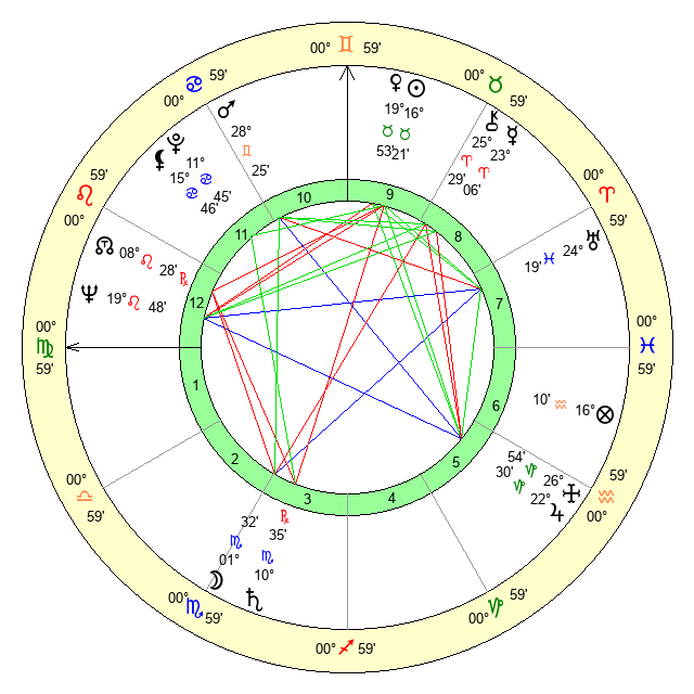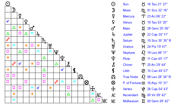 Moon | 1 Scorpio 31 | 19 Virgo 59 | 7 Cancer 36 |
