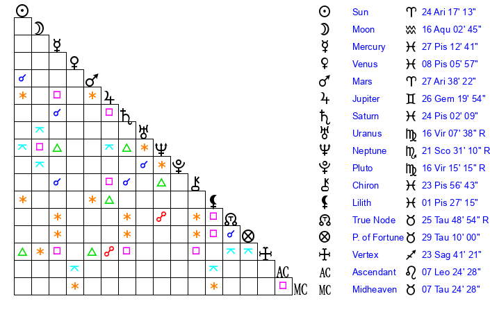 | Pluto | 16 Virgo 15 | 3 Aquarius 43 | 15 Virgo 53 |