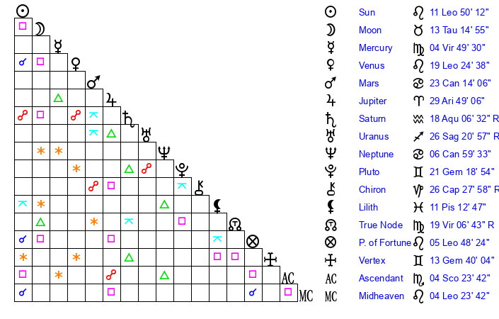 | Moon | 13 Taurus 3 | 17 Sagittarius 34 | 25 Libra 53 |