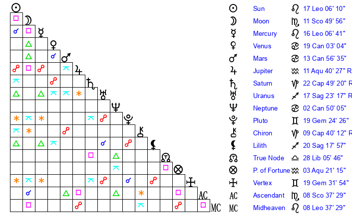 | Mercury | 16 Leo 7 | 4 Leo 16 | 18 Sagittarius 18 |