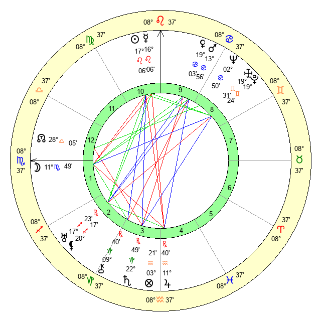 | Moon | 12 Scorpio 0 | 5 Pisces 50 | 1 Taurus 11 |