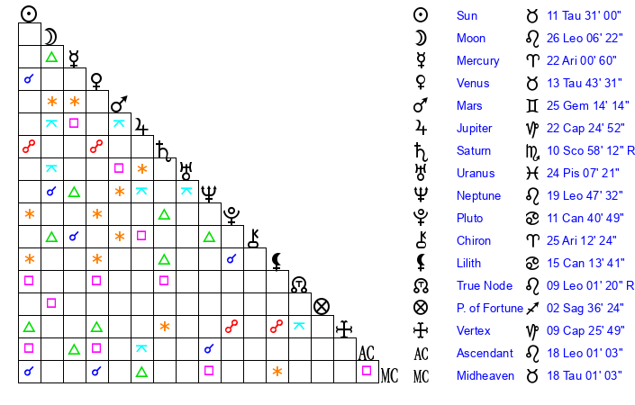 Moon | 26 Leo 18 | 16 Cancer 40 | 6 Taurus 50 |