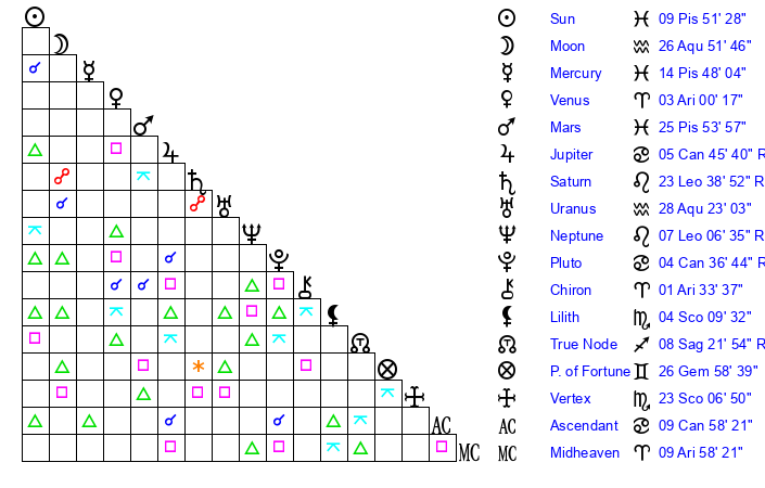 Sun | 9 Pisces 51 | 11 Pisces 9 | 23 Gemini 19 |