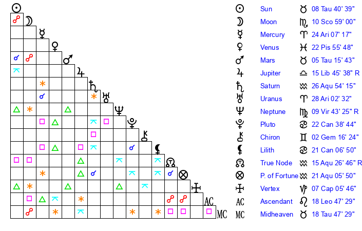 | Moon | 10 Scorpio 59 | 6 Gemini 33 | 20 Pisces 35 |
