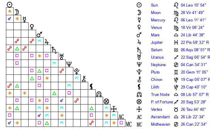 | Moon | 28 Virgo 44 | 20 Virgo 20 | 6 Pisces 32 |