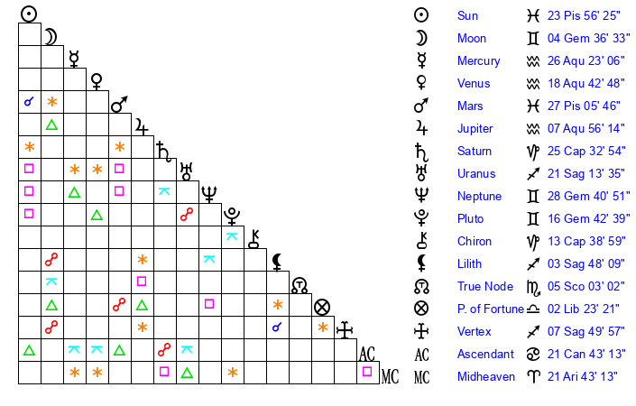 | Sun | 23 Pisces 56 | 25 Pisces 7 | 22 Cancer 57 |