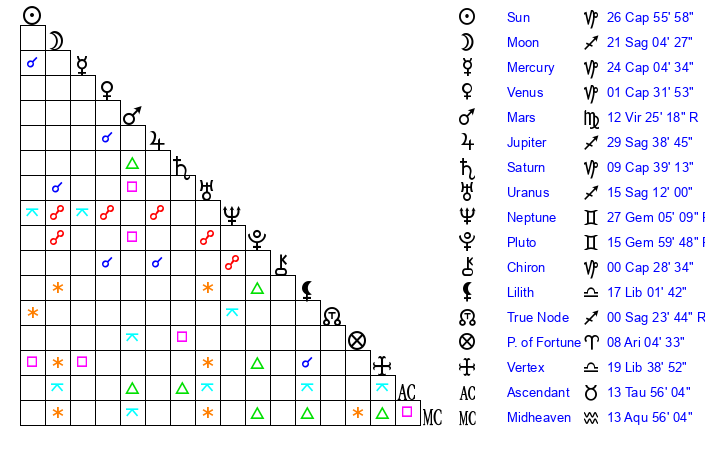 | Saturn | 10 Capricorn 8 | 15 Pisces 54 | 16 Capricorn 25 |