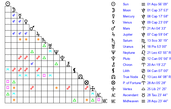 | Saturn | 14 Scorpio 2 | 16 Pisces 21 | 11 Scorpio 34 |