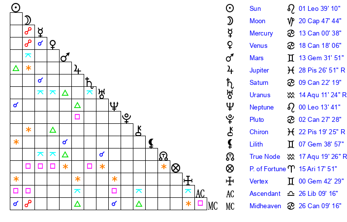 | Moon | 20 Capricorn 45 | 14 Leo 26 | 3 Aquarius 9 |