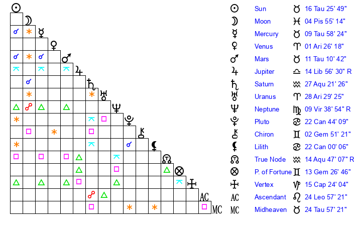 | Sun | 16 Taurus 26 | 17 Taurus 23 | 13 Leo 31 |
