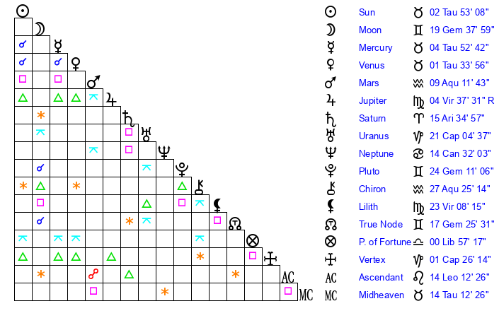 | Pluto | 24 Gemini 11 | 3 Aquarius 47 | 26 Gemini 36 |