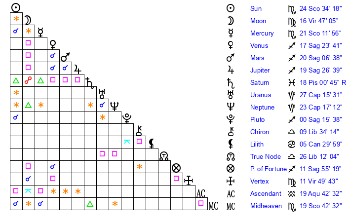 | Moon | 16 Virgo 45 | 24 Libra 6 | 21 Libra 23 |