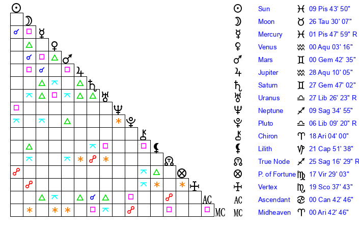 | Moon | 26 Taurus 35 | 19 Pisces 32 | 8 Aries 56 |
