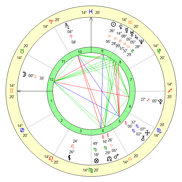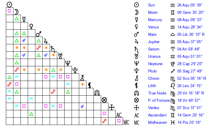 Jupiter | 5 Aquarius 37 | 11 Gemini 27 | 11 Aquarius 43 |