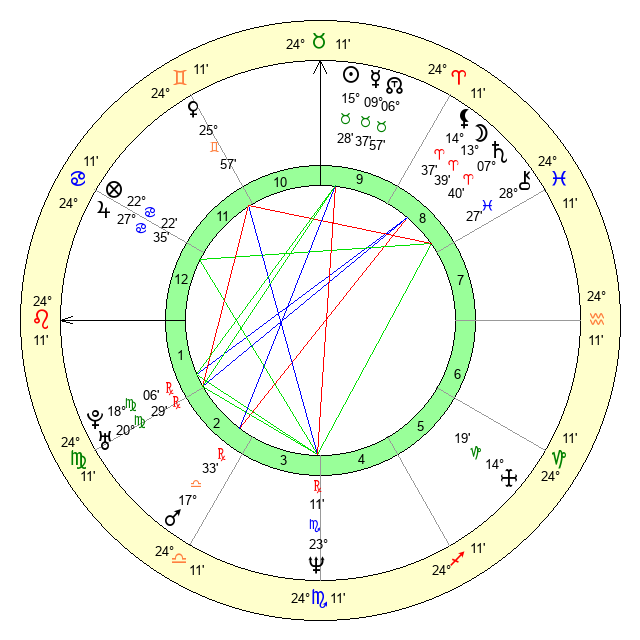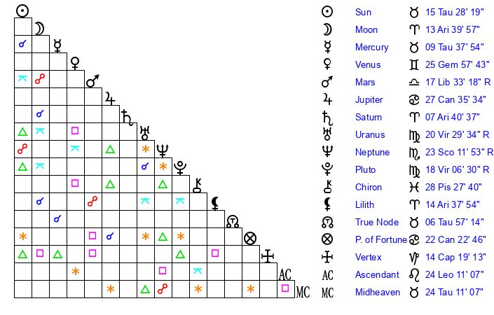 | Moon | 13 Aries 37 | 10 Virgo 57 | 24 Taurus 1 |