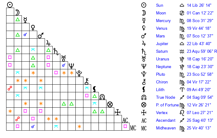 | Jupiter | 22 Libra 36 | 23 Cancer 14 | 29 Libra 31 |