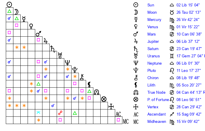 | Sun | 2 Libra 15 | 2 Libra 53 | 22 Sagittarius 22 |