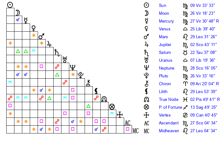 | Sun | 9 Virgo 33 | 10 Virgo 14 | 3 Scorpio 36 |