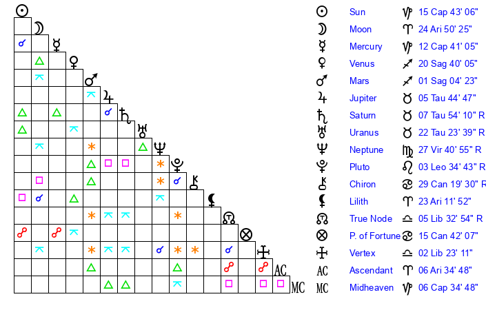 | Moon | 24 Aries 49 | 8 Aries 45 | 19 Taurus 0 |