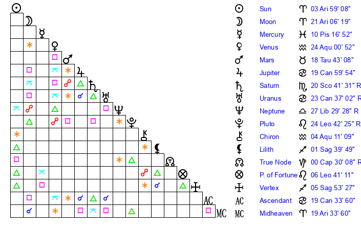 | Neptune | 27 Libra 29 | 29 Pisces 48 | 25 Libra 45 |