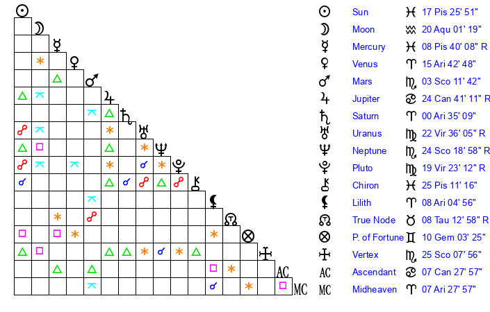 | Sun | 17 Pisces 26 | 18 Pisces 22 | 14 Taurus 31 |
