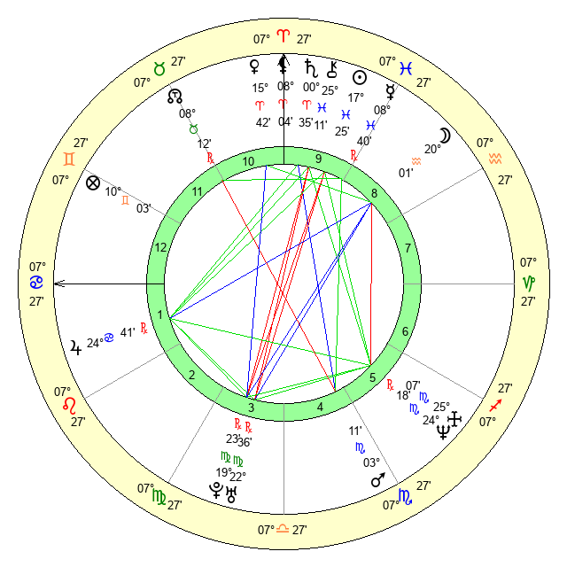 | Moon | 19 Aquarius 54 | 13 Cancer 43 | 1 Aries 49 |