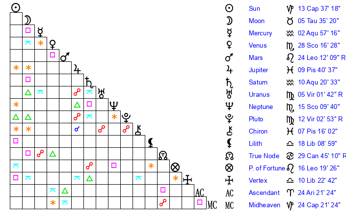 | Moon | 5 Taurus 42 | 14 Pisces 47 | 16 Leo 39 |