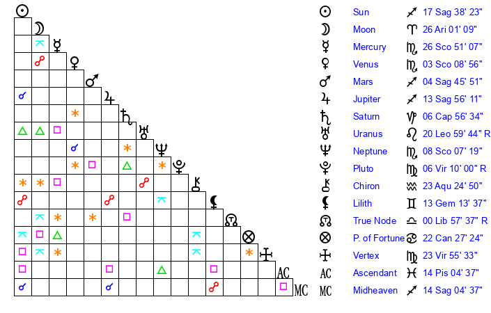 | Moon | 26 Aries 0 | 1 Virgo 56 | 15 Virgo 19 |