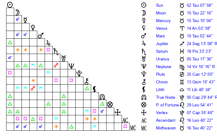 | Moon | 15 Taurus 22 | 19 Aquarius 34 | 19 Leo 27 |