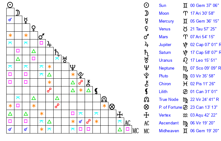 | Moon | 17 Aries 23 | 16 Pisces 12 | 24 Leo 17 |