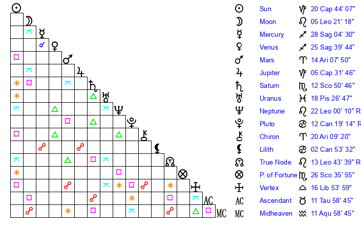 | Neptune | 21 Leo 59 | 27 Pisces 28 | 19 Leo 48 |