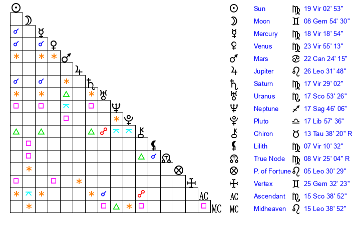 | Sun | 19 Virgo 3 | 19 Virgo 54 | 4 Scorpio 23 |